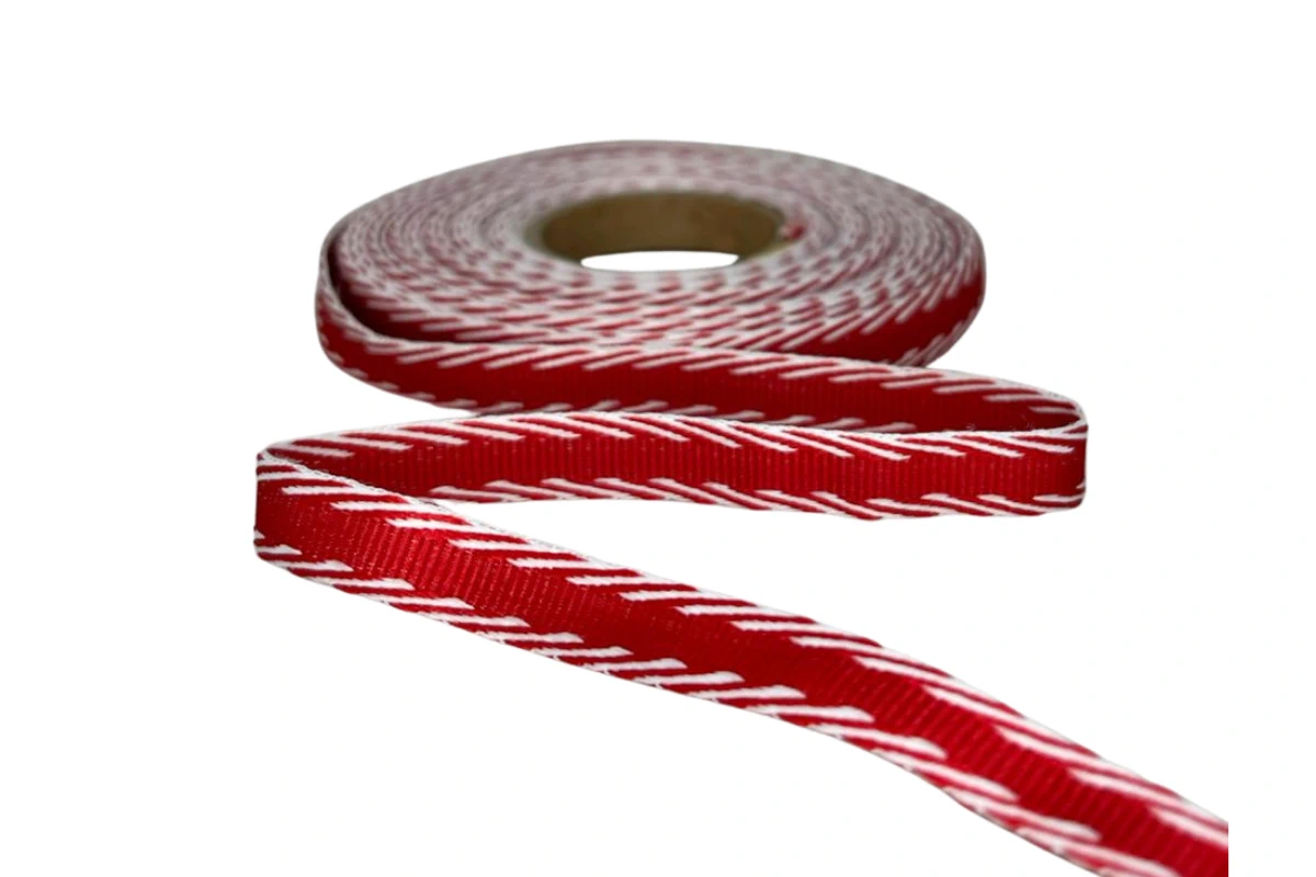 10mm Red & White Petersham Ribbon with Diagonal Weave & Red Centre