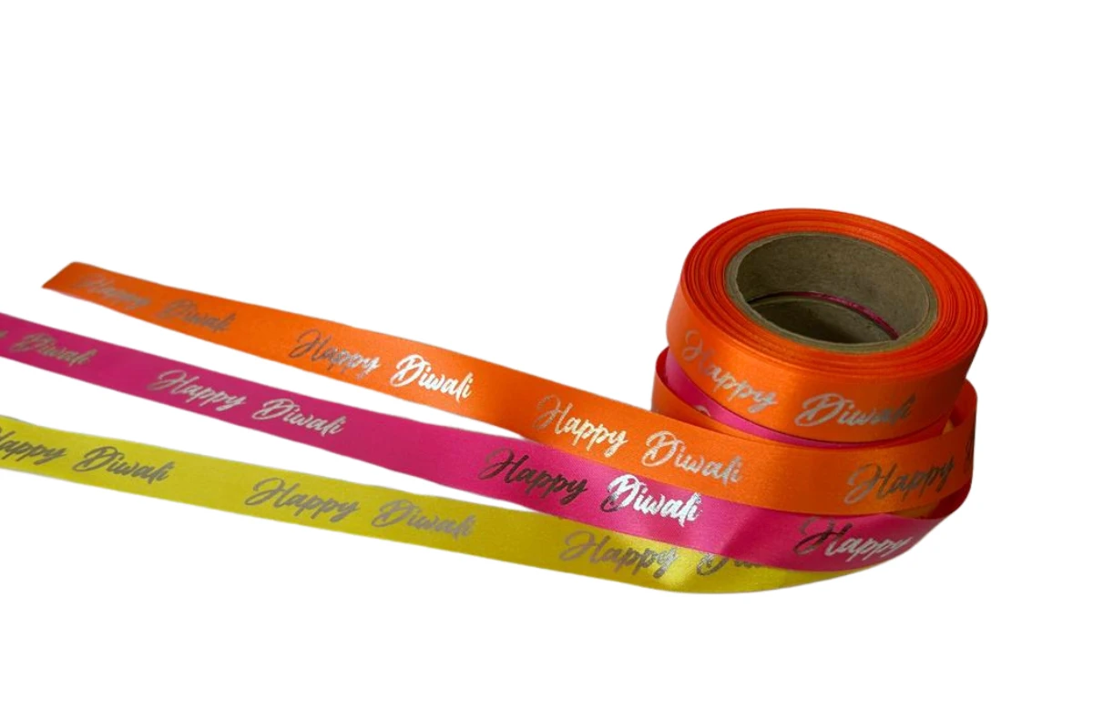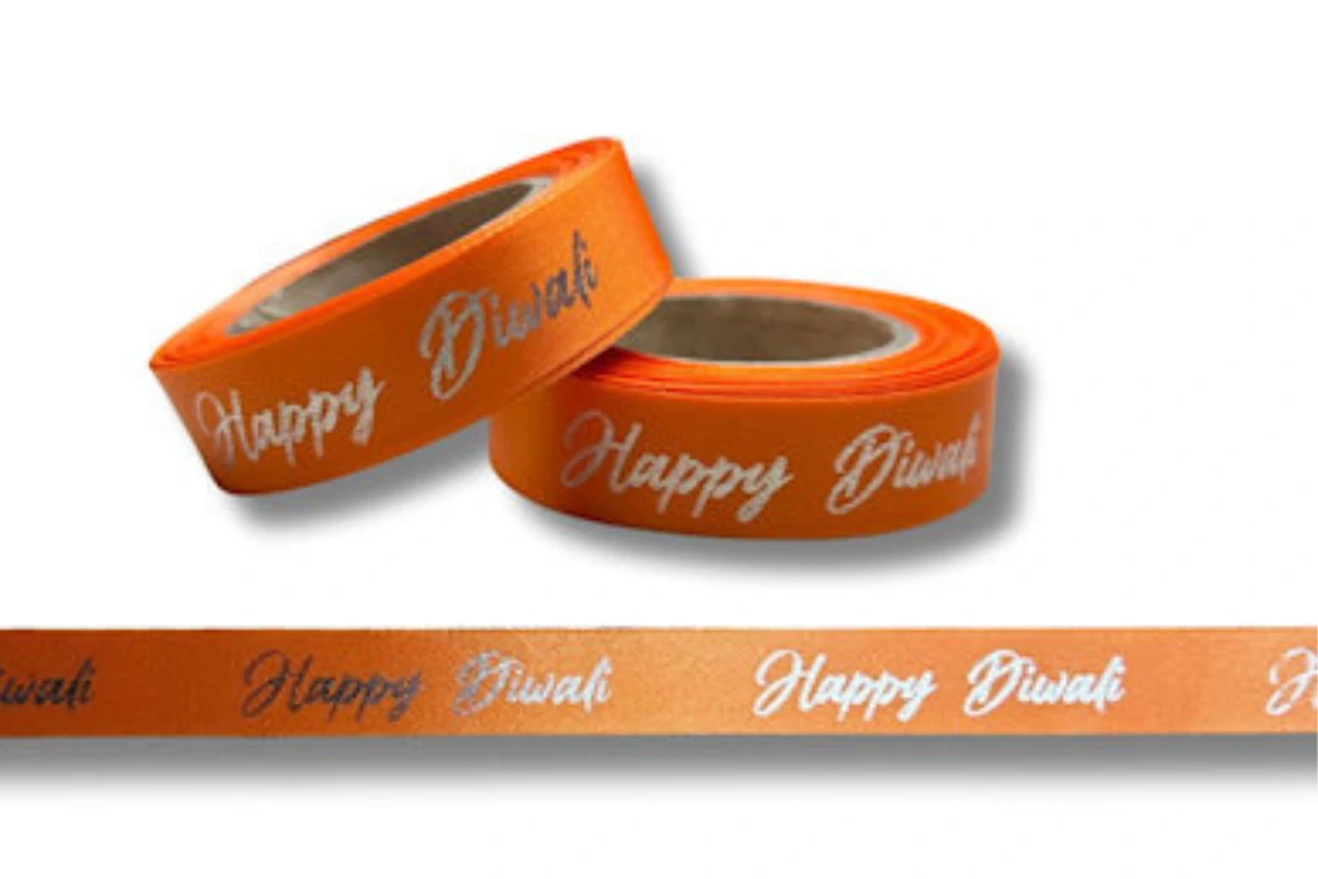 15mm Orange Satin Ribbon with Happy Diwali Print, 10m Roll