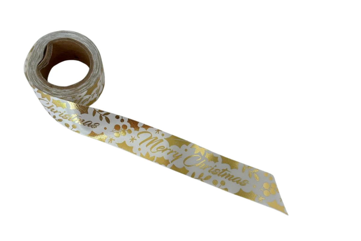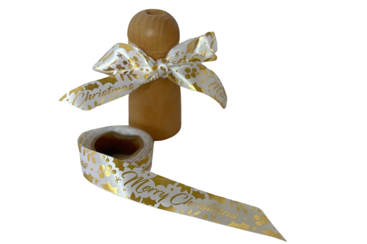 25mm White Satin Ribbon with Gold Foiled Merry Christmas Print, 10m Roll