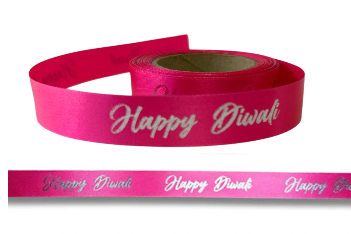 15mm Cerise Pink Satin Ribbon with Happy Diwali Print, 10m Roll