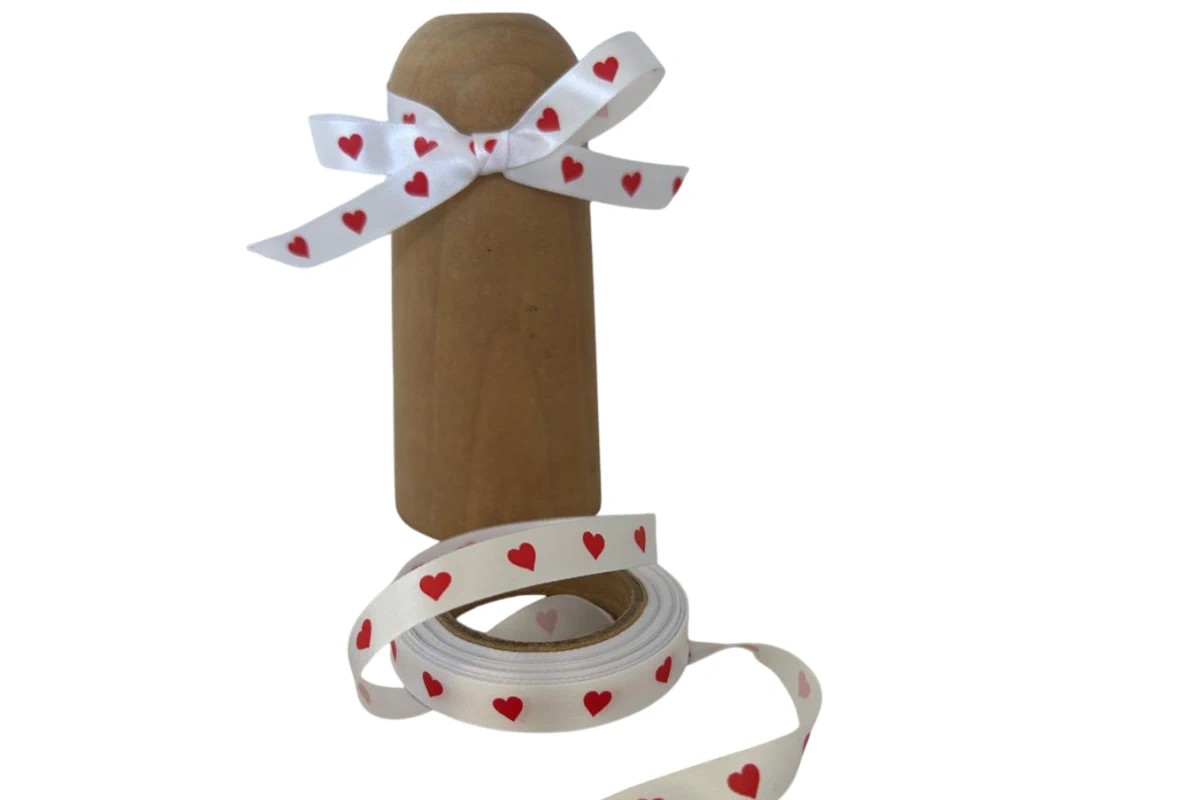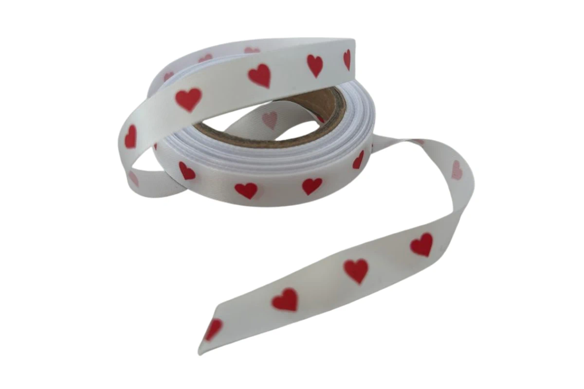 10mm White Satin Ribbon with Little Red Hearts Print for Romantic Decor